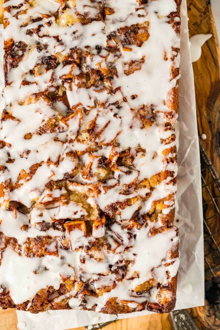 Delicious apple fritter bread! This quick bread is a true taste of autumn, combining the warm spices of cinnamon with the sweet-tart crunch of apples, finished with a sweet vanilla glaze.