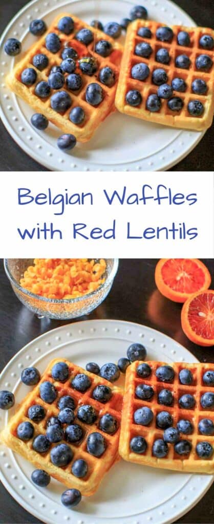 Belgian Waffles made healthy with split red lentils, blood orange juice and blueberries. Breakfast doesn’t get any better than this!