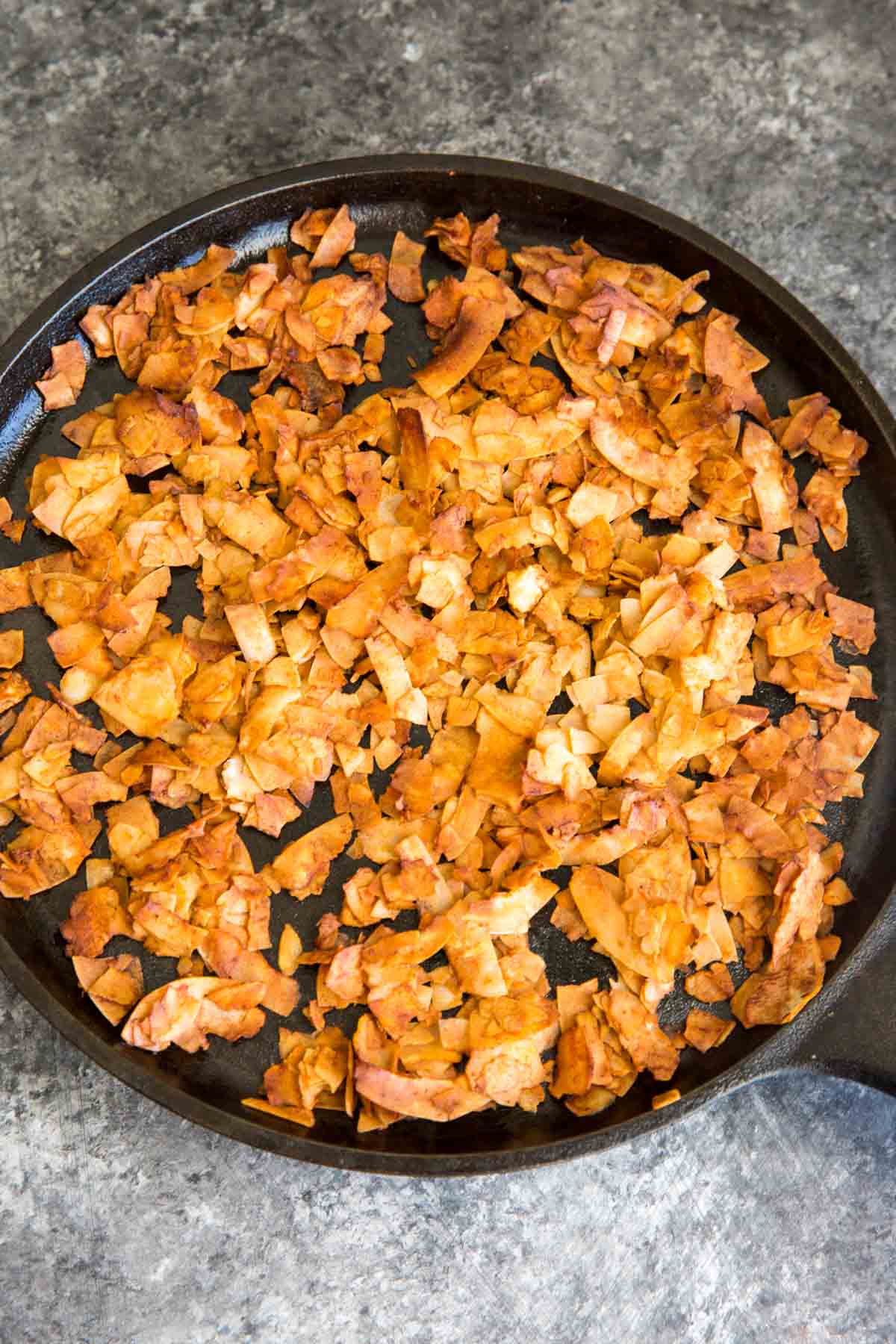 - Spray a cast iron pan or cookie sheet (I use coconut oil spray) and spread coconut chips in an even layer.