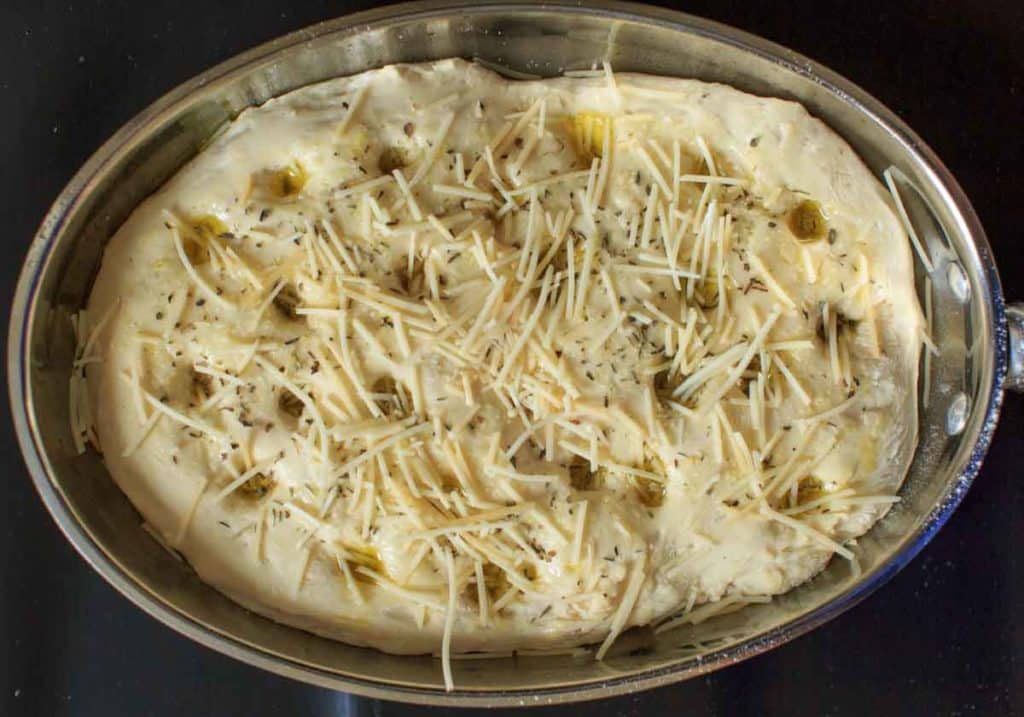 - Use 1 tablespoon of olive oil to grease baking sheet or pan close to 9x13 inch (I used a 12 inch oval skillet like this one) and press dough into shape of pan.