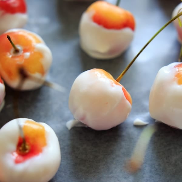 Dip your cherries in some greek yogurt, and lay them out on some wax paper. I used plain yogurt, with a little bit of homemade vanilla extract mixed in.
