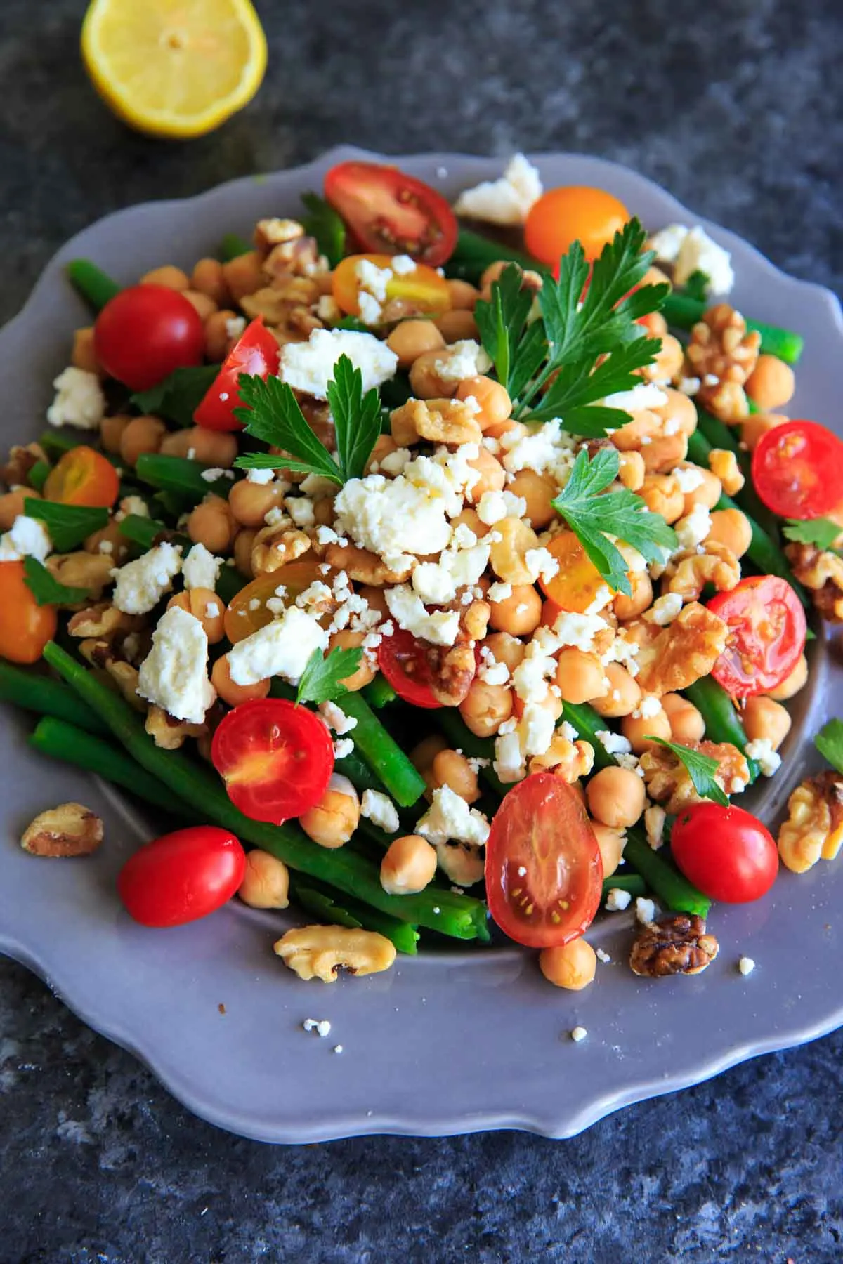 - On a serving plate, add green beans. Top with chickpeas, tomatoes, walnuts, ad feta.