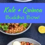 A customizable vegan friendly and gluten-free kale and quinoa buddha bowl. With tomato, avocado, black beans, corn, and more!