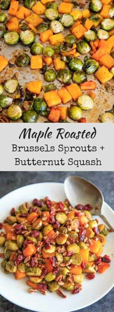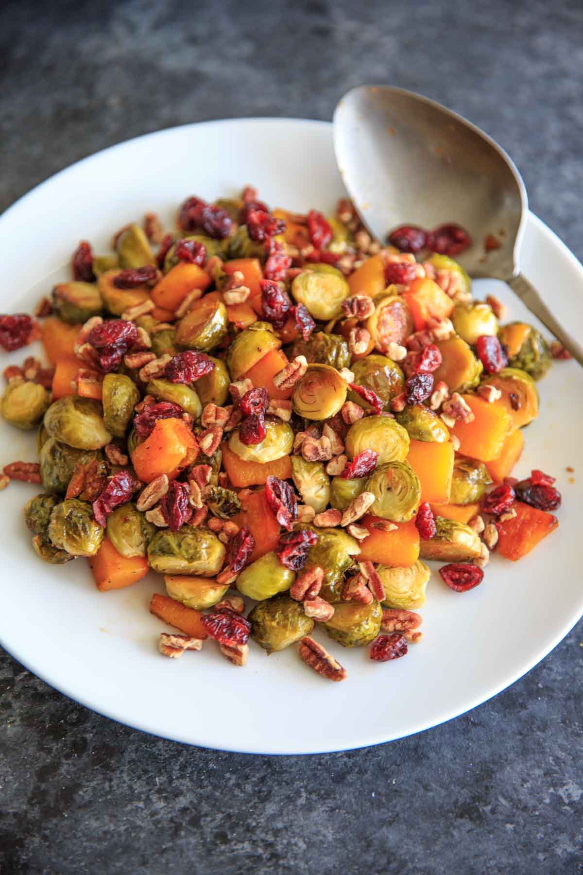 Maple roasted Brussels sprouts and butternut squash with pecan pieces and dried cranberries. A perfect appetizer or side for holiday or Autumn dinners. Gluten-free, vegan.