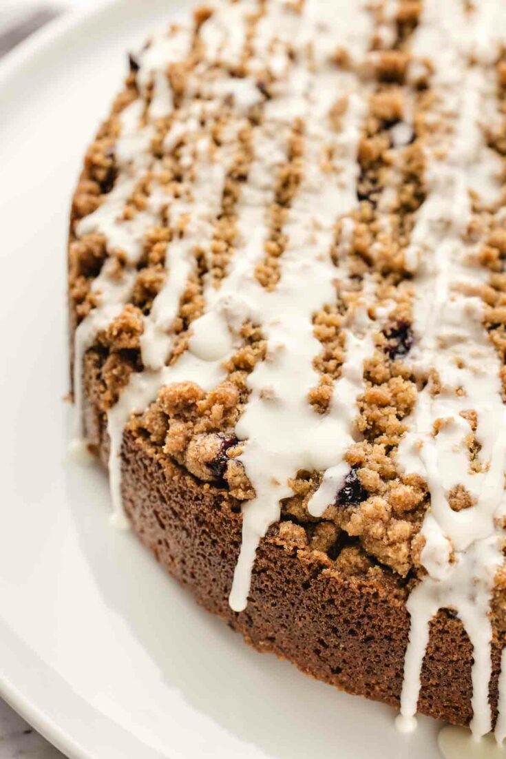 This coffee cake has sweet and juicy fresh blueberries in every bite. The cake is incredibly moist and tender with a crunchy, buttery streusel topping that adds a perfect contrast of texture, and is drizzled with a delicious light lemon glaze. Perfect for breakfast with your morning coffee. It will feel like a slice of pure indulgence!