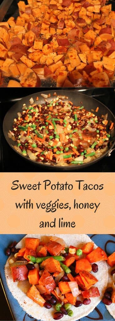 Sweet potato tacos with black beans, vegetables and a hint of honey and lime. Flavorful vegetarian dinner the whole family will love!